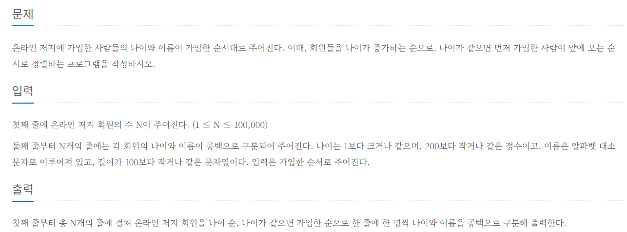나이 순으로 정렬하고 나이가 같다면 먼저 입력된 순으로 정렬하는 문제이다.
