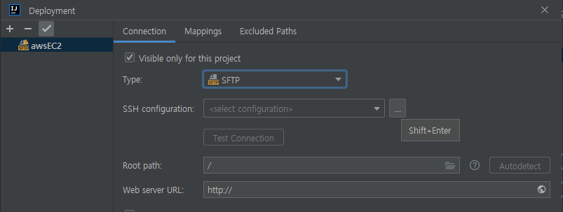 - Type : SFTP 선택(아마도 기본으로 선택되어있음)