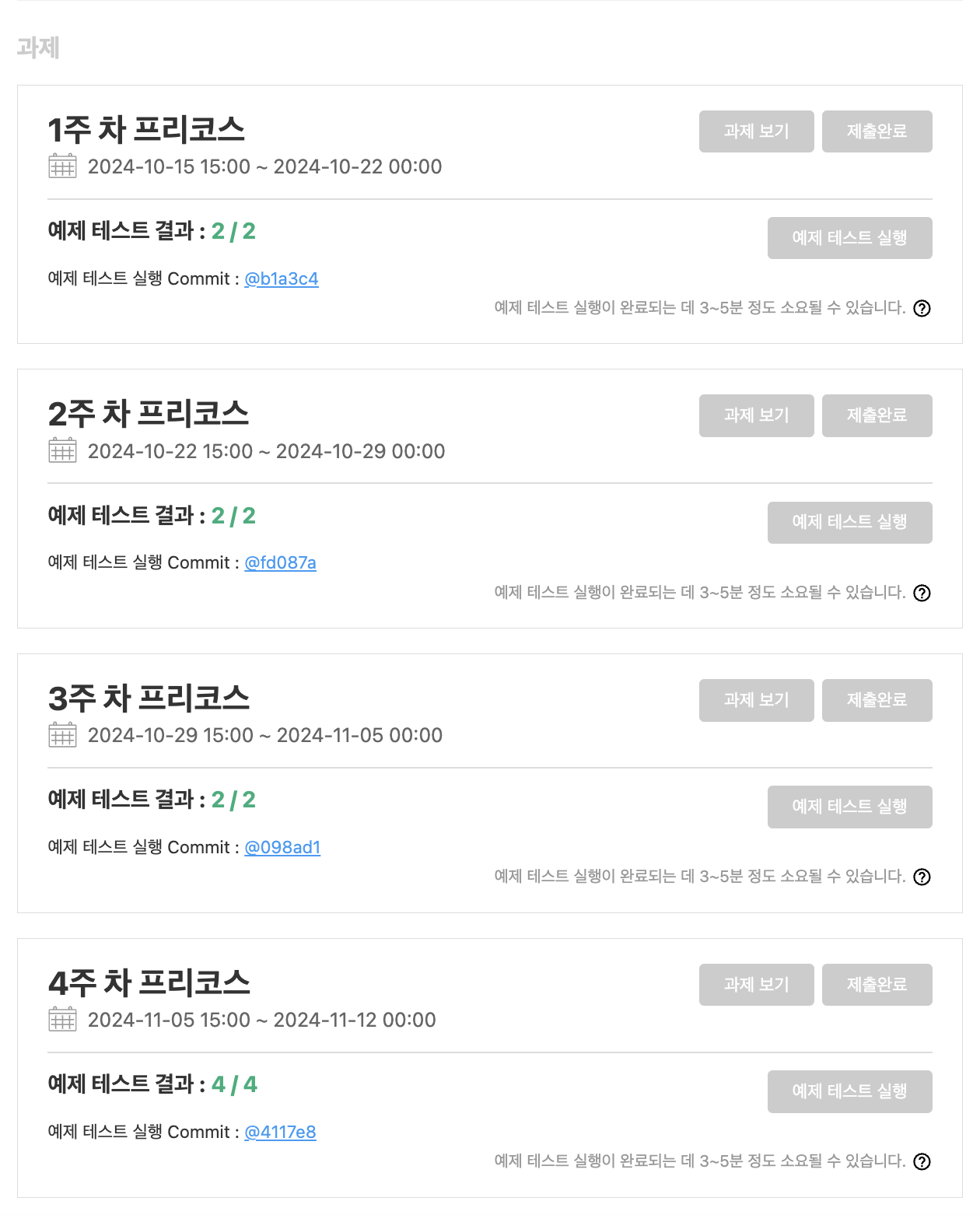 해당 부분을 적용해가면서 다음 주차 프리코스를 진행했는데 그러면서 스스로 코드가 많이 나아지는게 느껴져서 매주 즐겁게 프리코스에 임할 수 있었다.