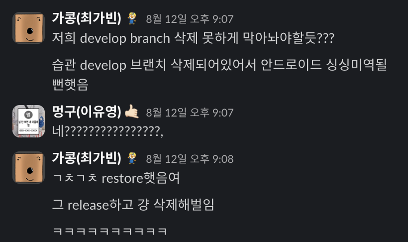 아직 2명이 approve 하기 전에는 Merge 하면 안 되는데 한명이 해버린다거나, develop branch는 삭제하면 안되는데 관성적으로 merge 한 브랜치를 삭제하다 보니 그냥 삭제해 버린다거나, squash merge를 해야 하는데 그냥 merge를 한다거나.. 정말 많은 경우가 있었다..