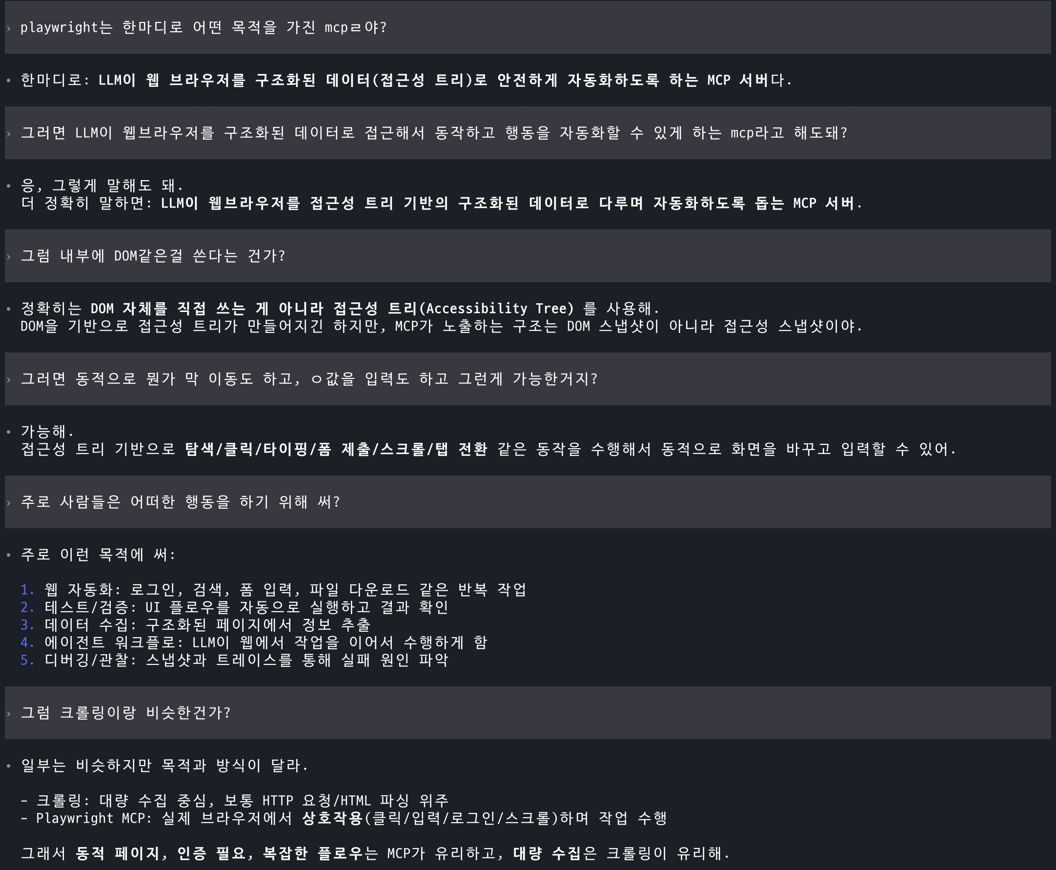 LLM이 웹브라우저를 접근성 트리 기반의 구조화된 데이터로 다루며 자동화하도록 돕는 MCP 서버다.